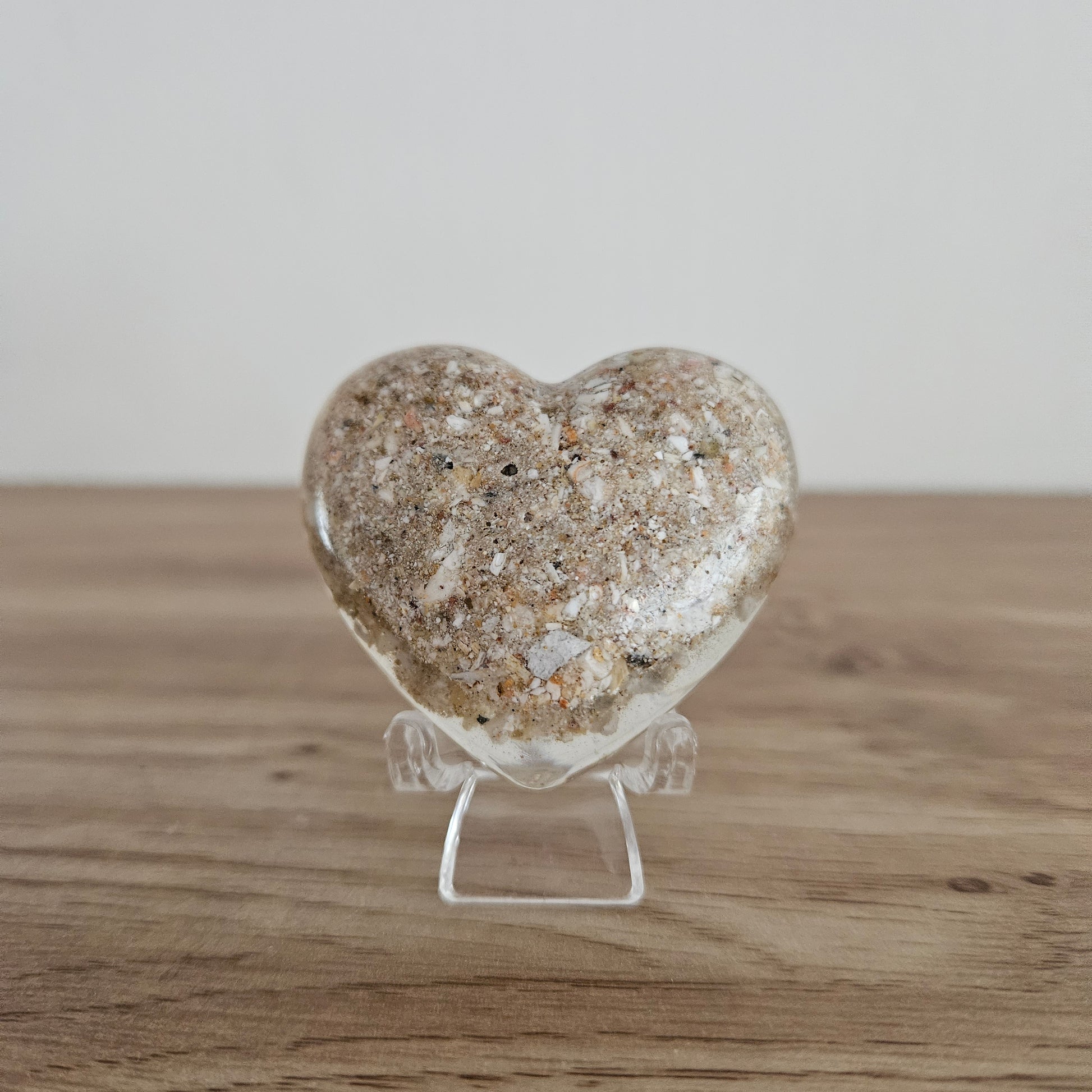 Voor een volledig epoxy herinneringsstukje gebruiken wij bij voorkeur voldoende as (bij een hartje minimaal 40 gram, ca. 4 grote eetlepel). Is er minder as beschikbaar? Dan kunnen we in overleg het epoxy herinneringsstukje aanvullen met schelpenzand. Dit is optioneel en zorgt ervoor dat ook met een kleinere hoeveelheid as een epoxy herinneringsstukje gemaakt kan worden.