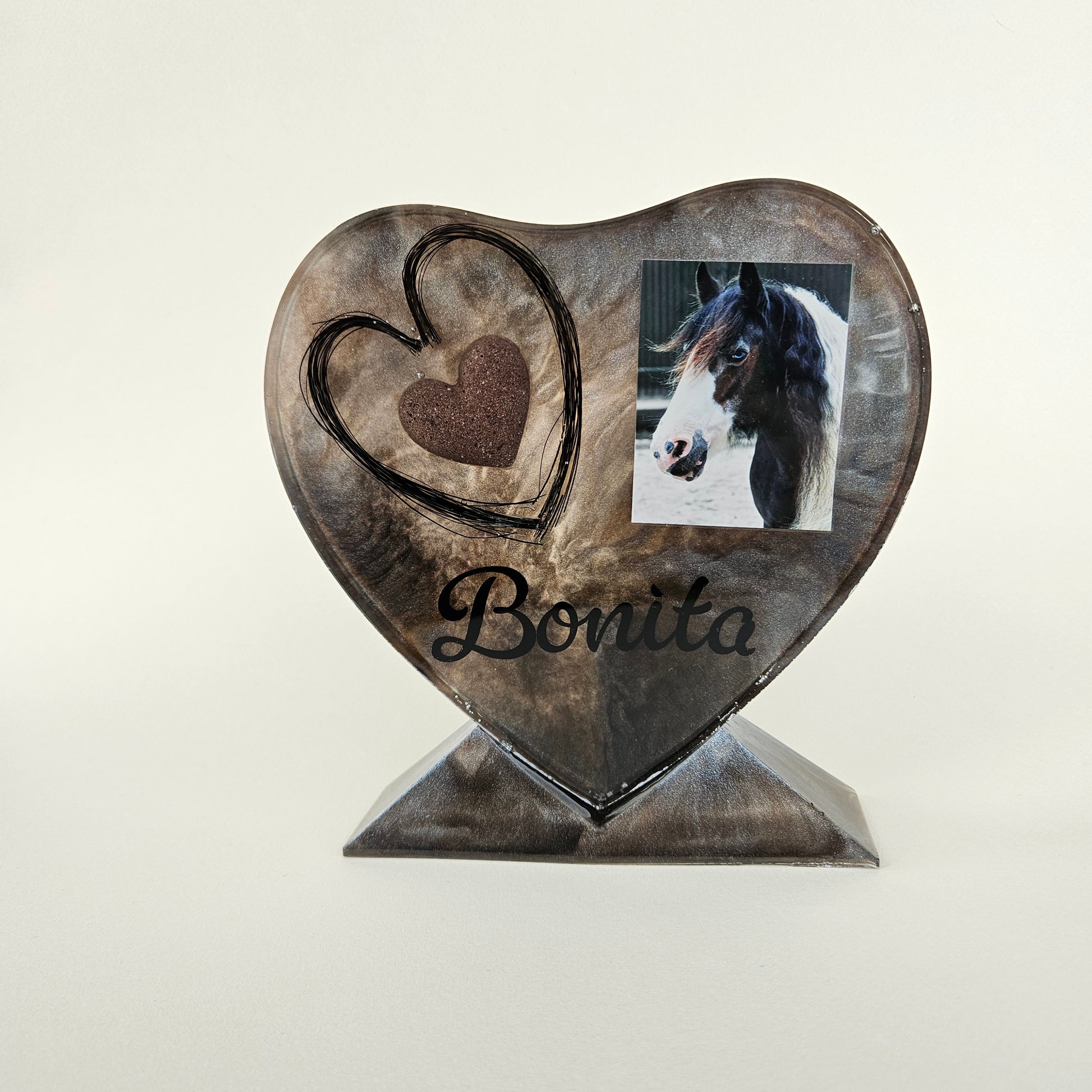 Ons handgemaakte Epoxy Herinneringshart staand M (ca 17.5 x 15 x 1 cm) wordt speciaal voor jou gemaakt en kan zowel as als haar of een combinatie daarvan bevatten. Zo ontstaat een blijvende en tastbare herinnering aan jouw dierbare.
