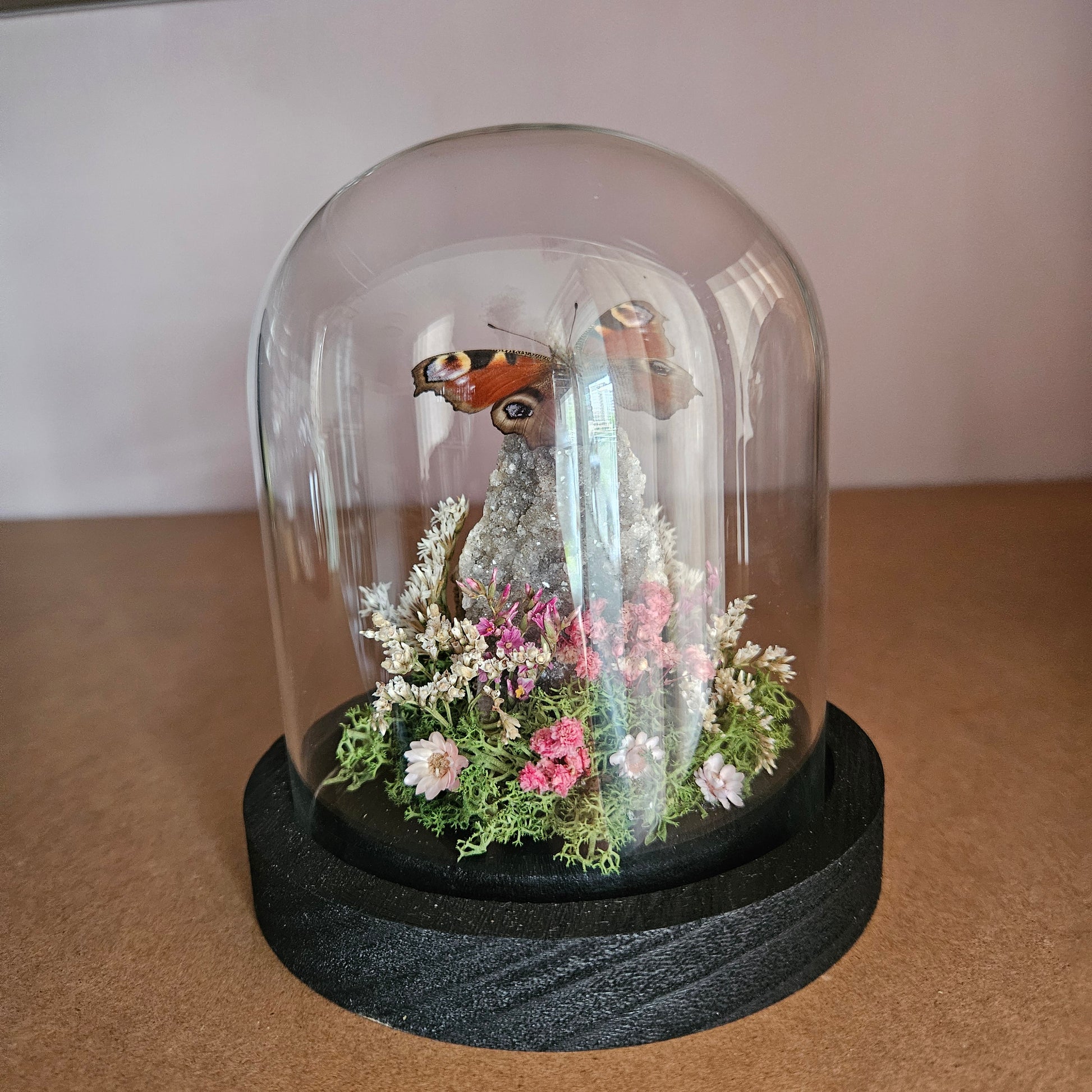 Deze prachtige vlinderstolp brengt de schoonheid van de natuur op een bijzondere manier in huis. Met een zorgvuldig geprepareerde vlinder en natuurlijke elementen zoals bloemen en takjes, is deze stolp niet alleen een stijlvol decoratiestuk, maar soms ook een persoonlijk aandenken. Sommige klanten kiezen ervoor om deze stolpen te gebruiken als herdenkingsstolp, een liefdevolle manier om een dierbare te herinneren.