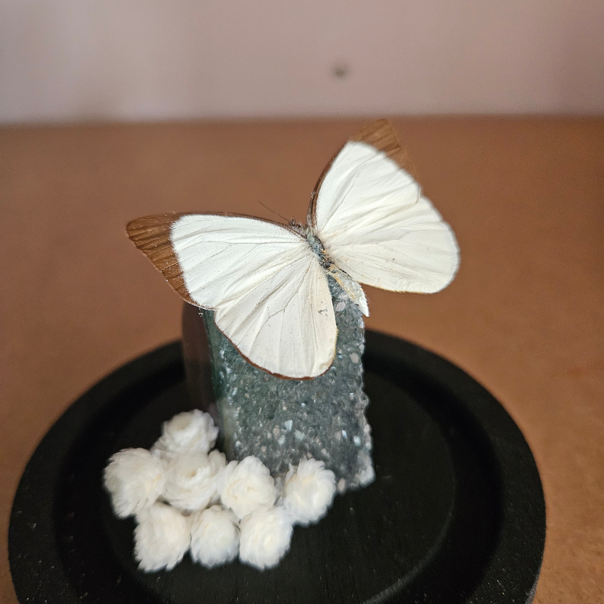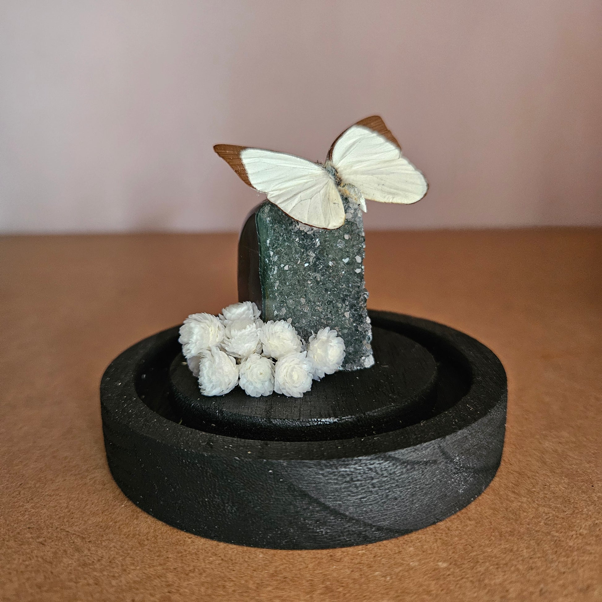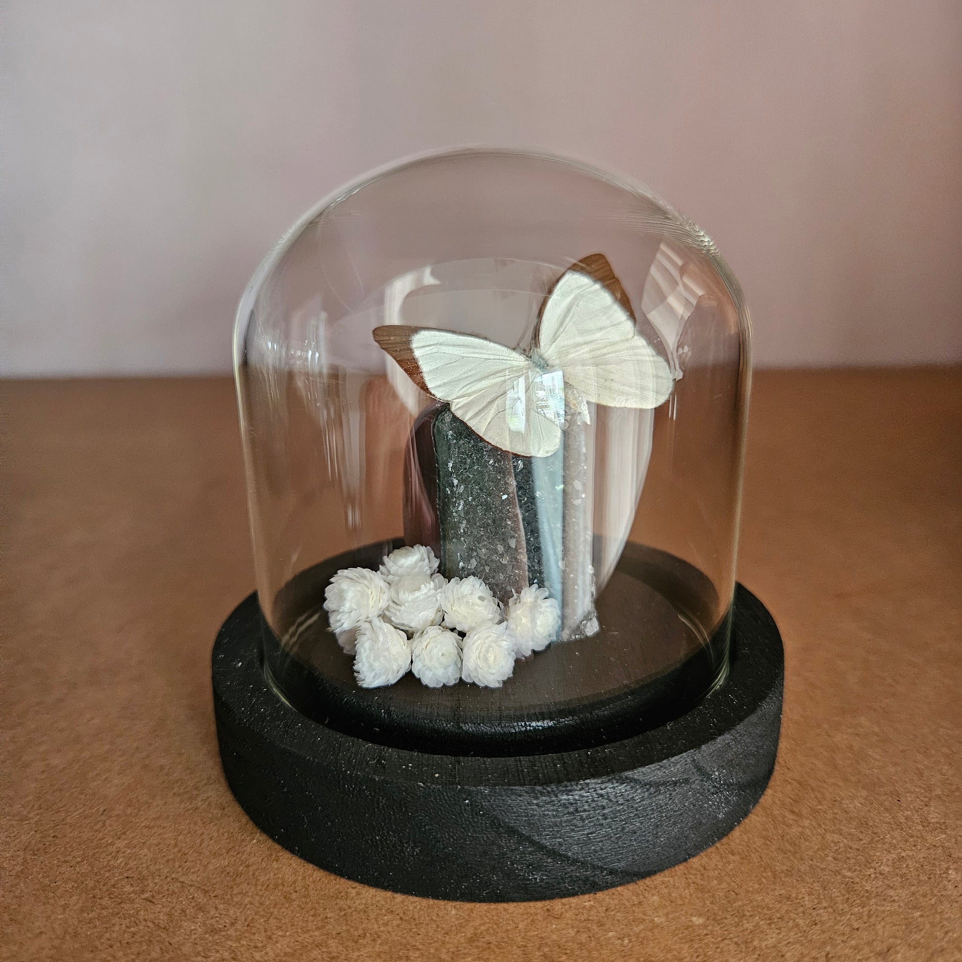 Deze prachtige vlinderstolp brengt de schoonheid van de natuur op een bijzondere manier in huis. Met een zorgvuldig geprepareerde vlinder en natuurlijke elementen zoals bloemen en takjes, is deze stolp niet alleen een stijlvol decoratiestuk, maar soms ook een persoonlijk aandenken. Sommige klanten kiezen ervoor om deze stolpen te gebruiken als herdenkingsstolp, een liefdevolle manier om een dierbare te herinneren.