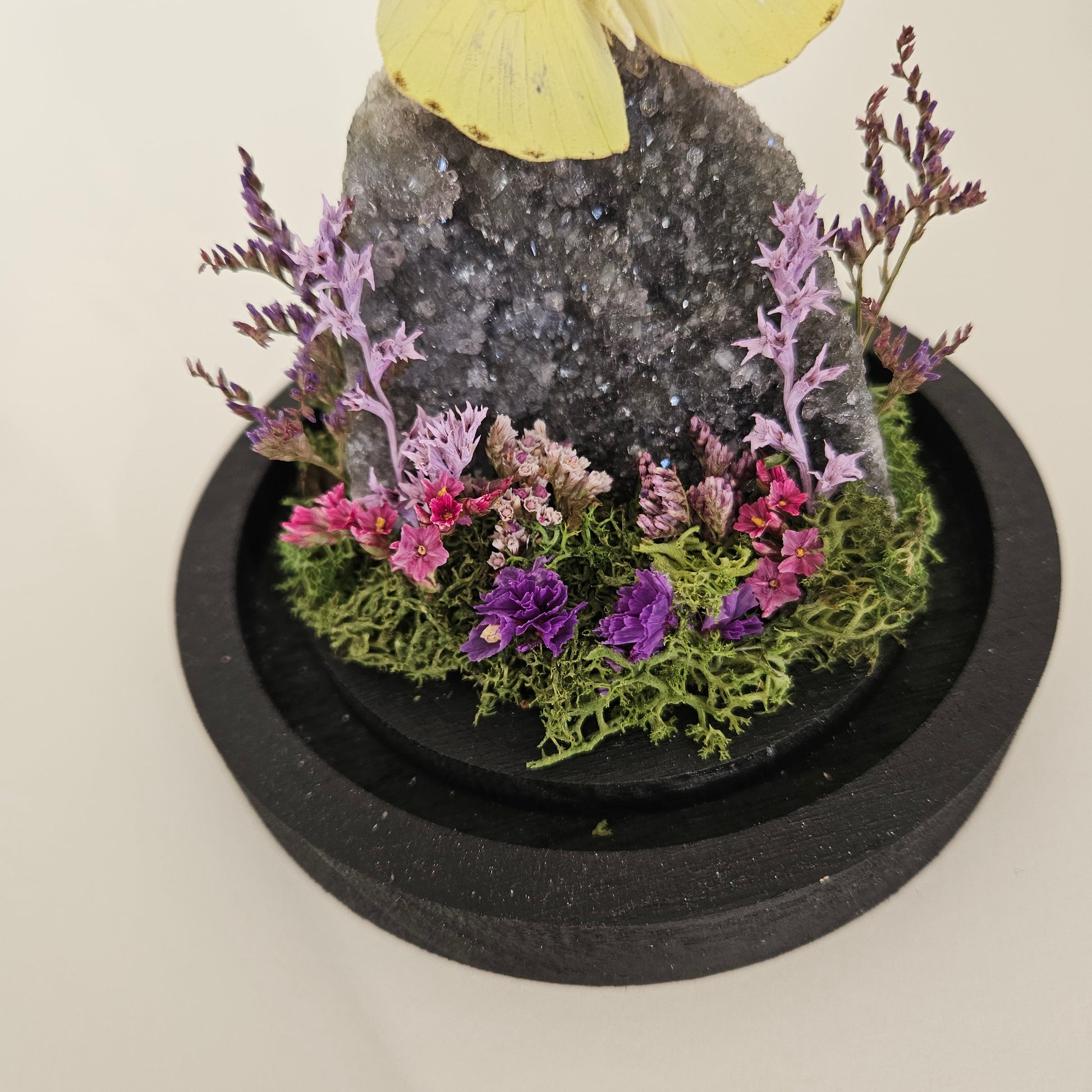 Deze prachtige vlinderstolp brengt de schoonheid van de natuur op een bijzondere manier in huis. Met een zorgvuldig geprepareerde vlinder en natuurlijke elementen zoals bloemen en takjes, is deze stolp niet alleen een stijlvol decoratiestuk, maar soms ook een persoonlijk aandenken. Sommige klanten kiezen ervoor om deze stolpen te gebruiken als herdenkingsstolp, een liefdevolle manier om een dierbare te herinneren.