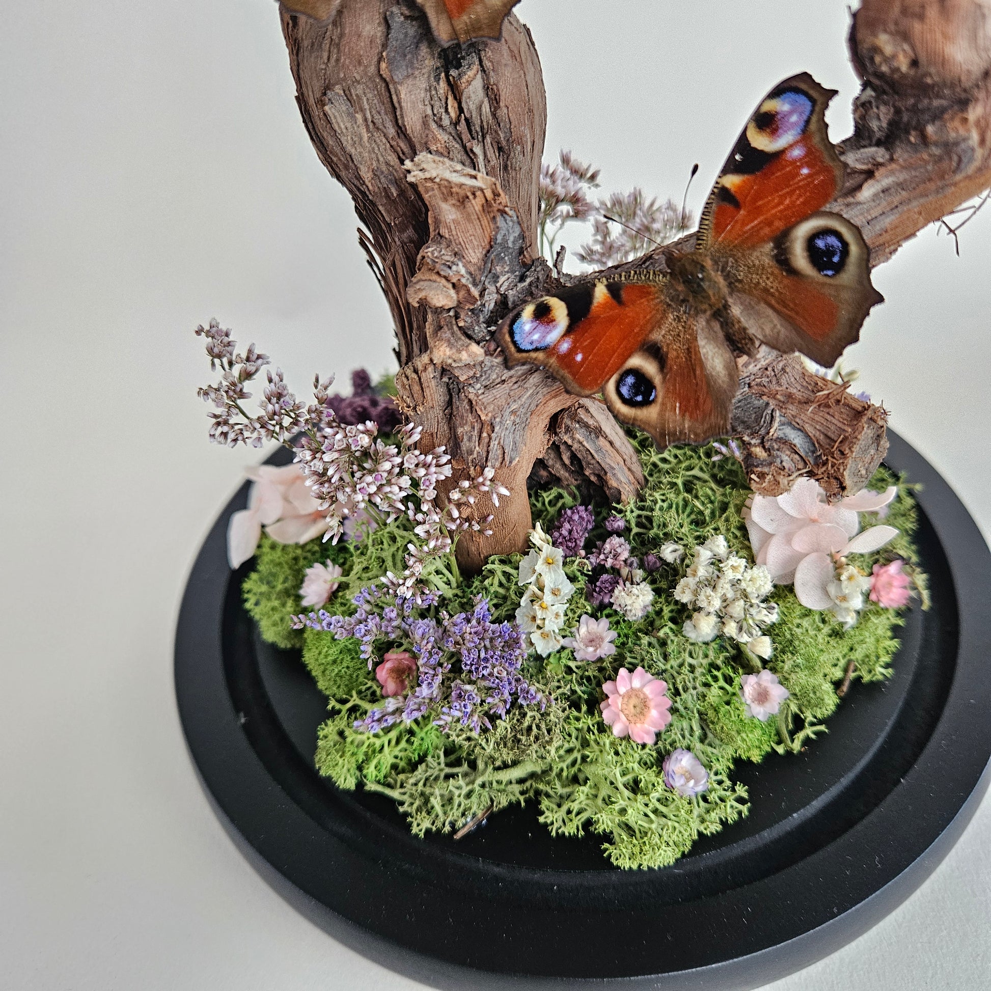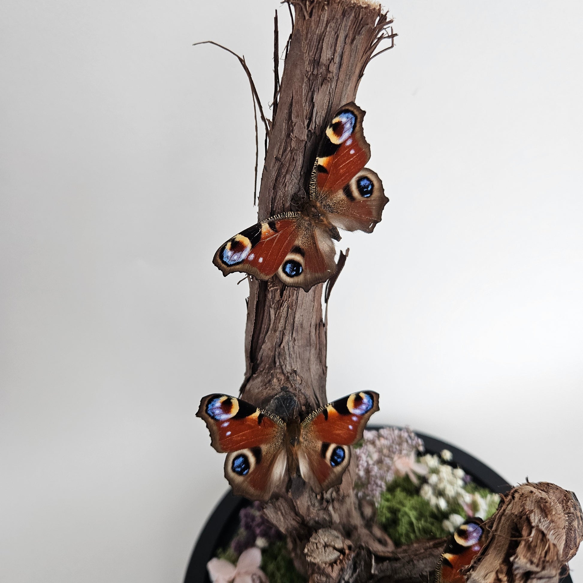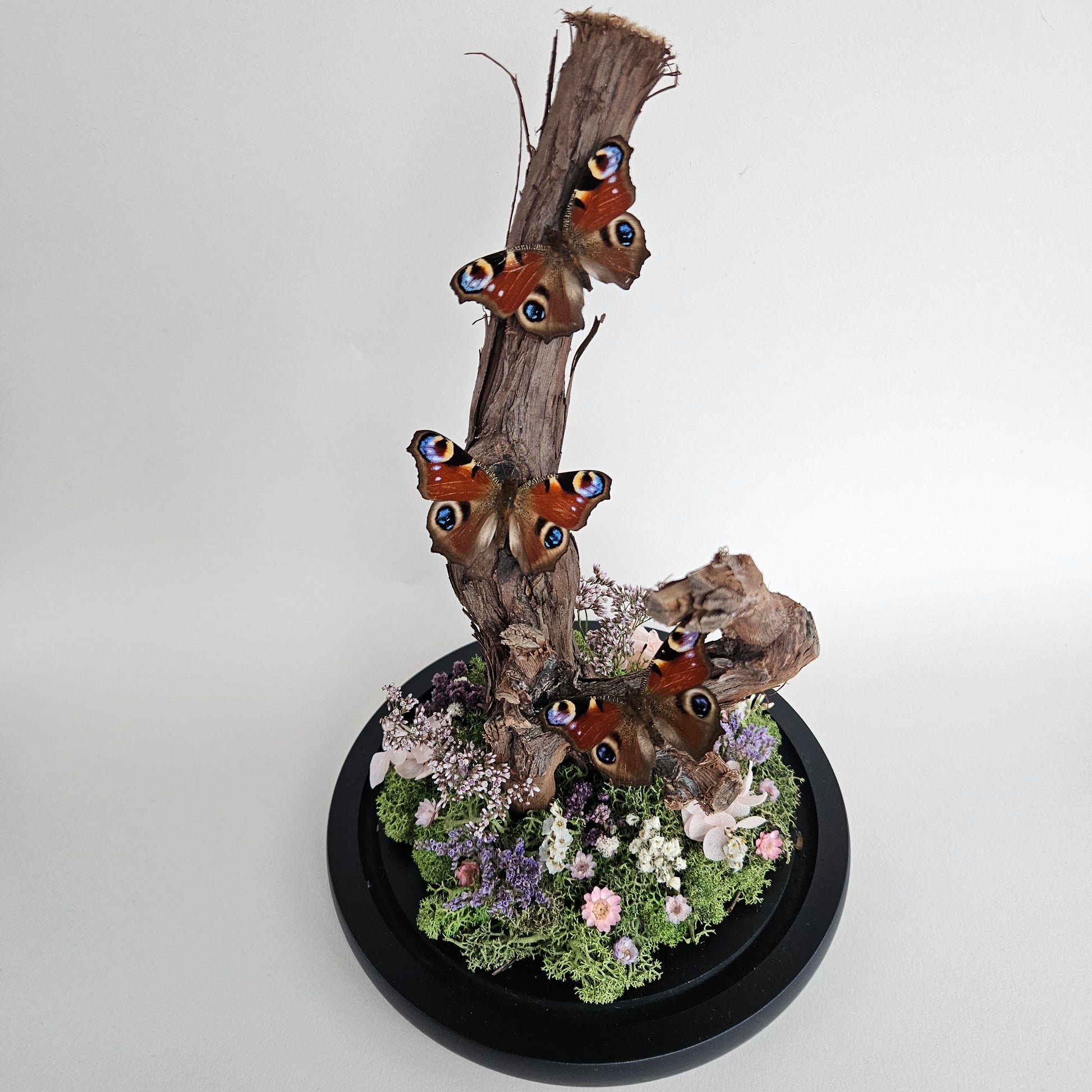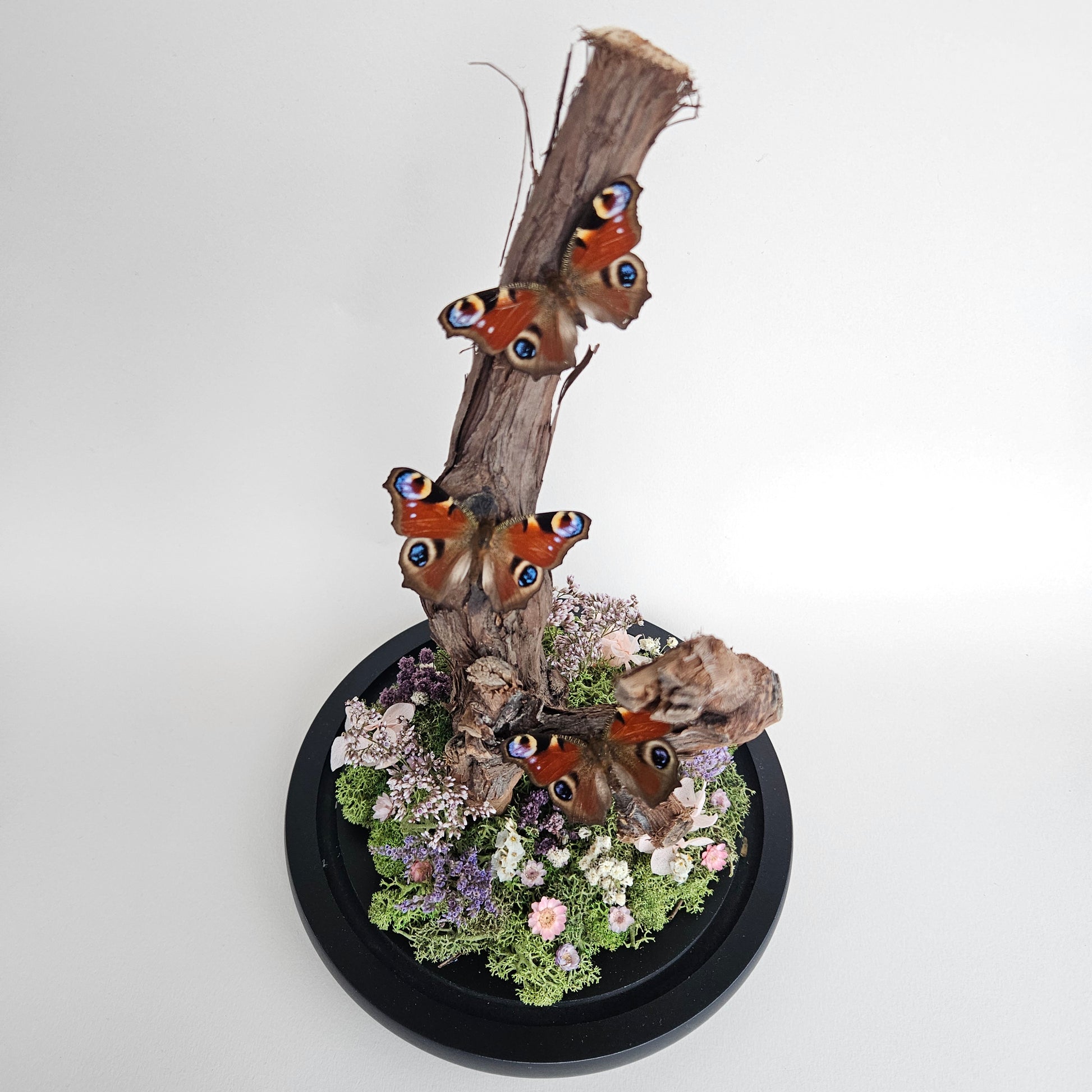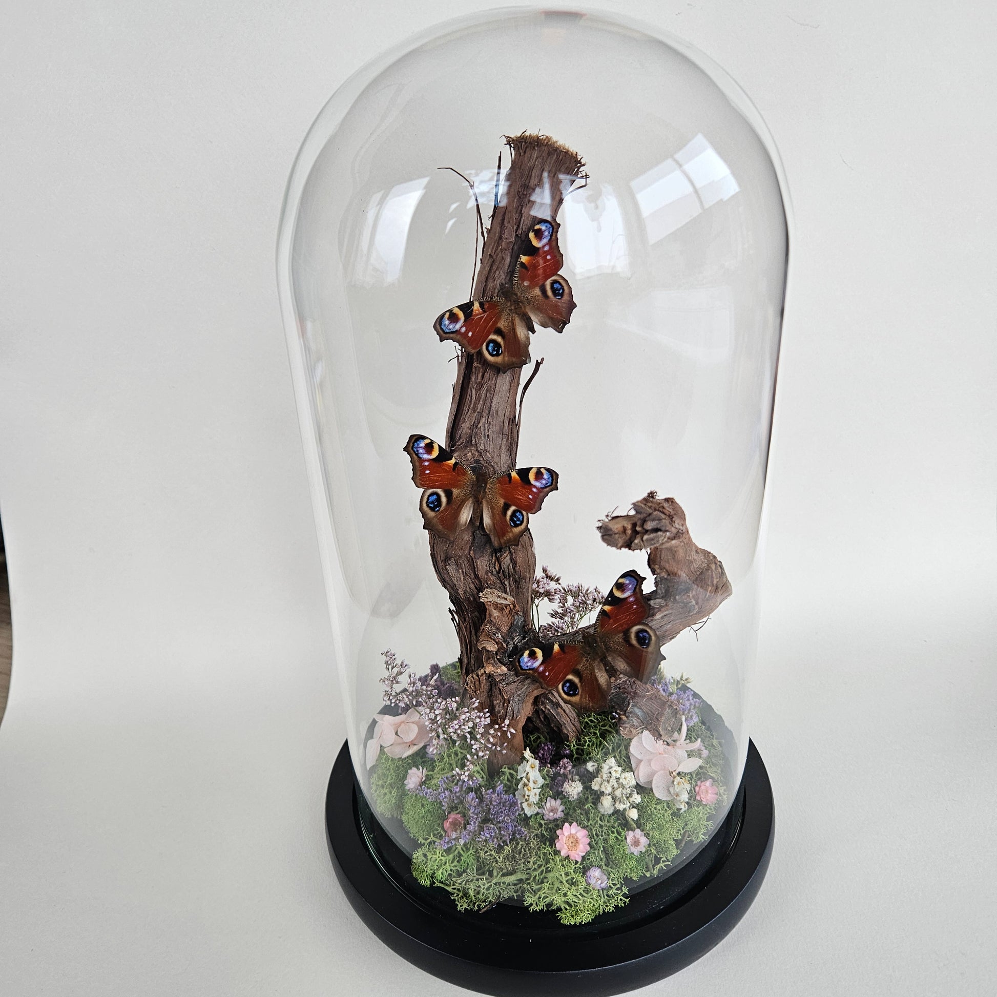 Deze prachtige vlinderstolp brengt de schoonheid van de natuur op een bijzondere manier in huis. Met een zorgvuldig geprepareerde vlinder en natuurlijke elementen zoals bloemen en takjes, is deze stolp niet alleen een stijlvol decoratiestuk, maar soms ook een persoonlijk aandenken. Sommige klanten kiezen ervoor om deze stolpen te gebruiken als herdenkingsstolp, een liefdevolle manier om een dierbare te herinneren.